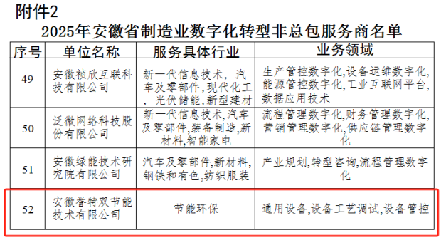 根據(jù)《安徽省工業(yè)和信息化廳關(guān)于公開征集2025年度制造業(yè)數(shù)字化轉(zhuǎn)型服務(wù)商的通知》,經(jīng)各服務(wù)商提交申報(bào)材料、專家評(píng)審等程序,省工信廳最終確定發(fā)布203家服務(wù)商,我公司名列榜單,在此表示熱烈祝賀!
