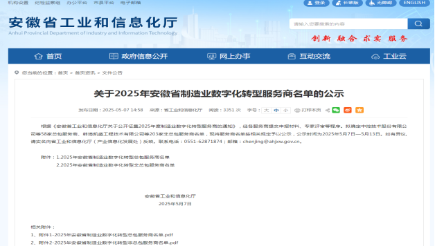根據(jù)《安徽省工業(yè)和信息化廳關(guān)于公開征集2025年度制造業(yè)數(shù)字化轉(zhuǎn)型服務商的通知》,經(jīng)各服務商提交申報材料、專家評審等程序,省工信廳最終確定發(fā)布203家服務商,我公司名列榜單,在此表示熱烈祝賀!